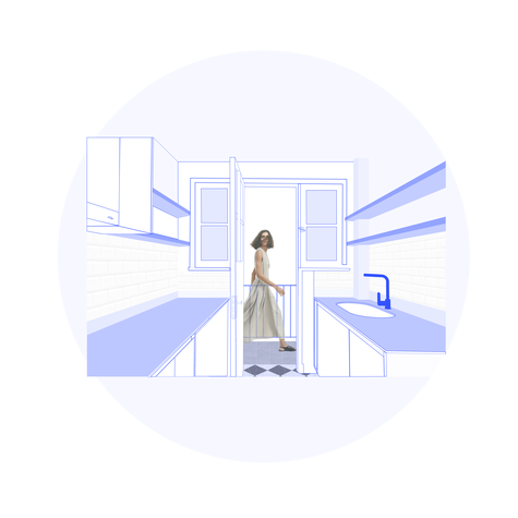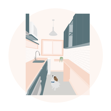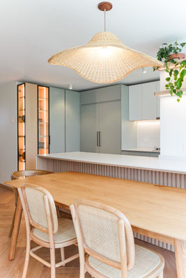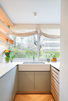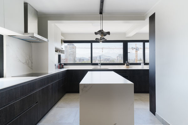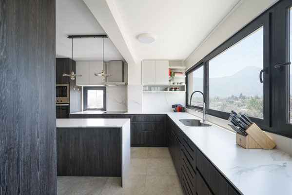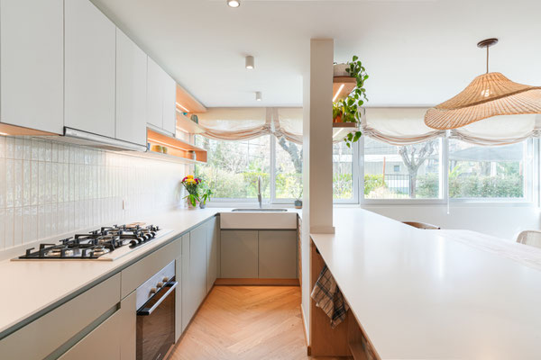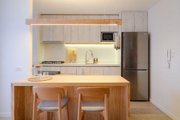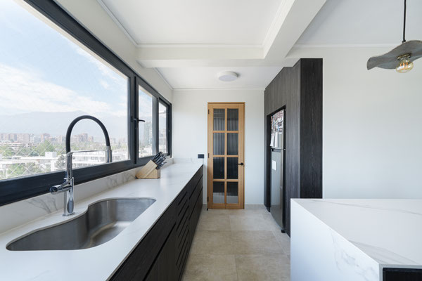 En este departamento el encargo era remodelar una cocina de los años 90 e integrar la loggia a esta, incorporando el espacio de terraza a la cocina que se transforma en un espacio de permanencia.