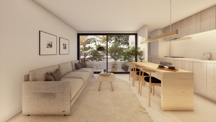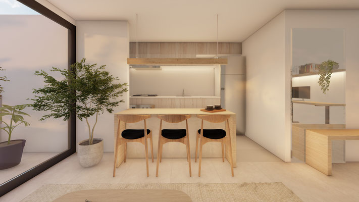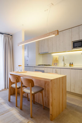 El encargo, en este departamento, era integrar la cocina al espacio de estar y comedor, a través de una isla , así también se logro integrar el acceso generando un espacio luminoso y con mayor amplitud.