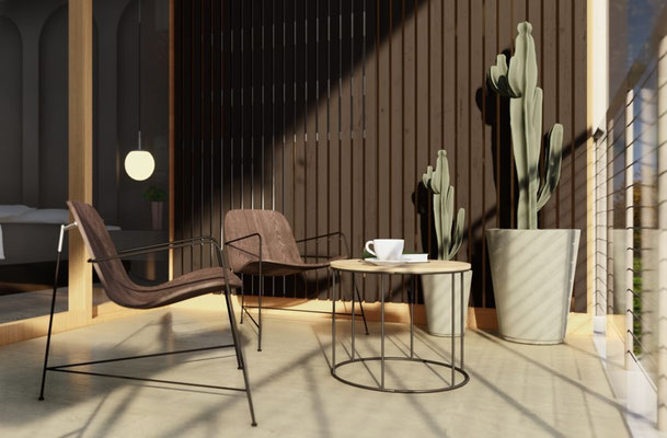 Los materiales propuestos fueron principalmente cielos de madera tinglada , muros blancos y piso en porcelanato gris , generando una paleta neutra.