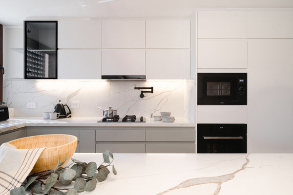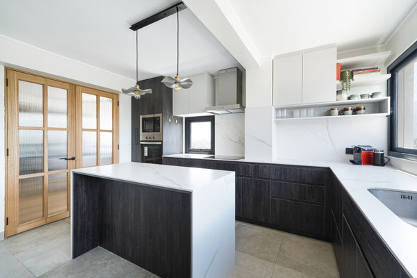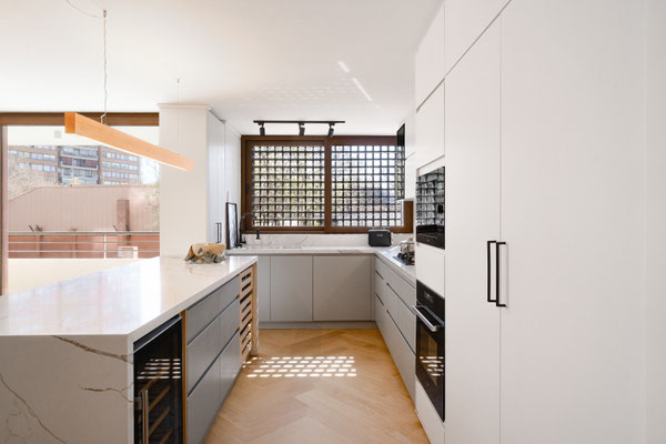 Los materiales fueron cuarzo para la isla en tonos blanco y grises y se enmarco el acceso integrando la cocina con panelwood.
