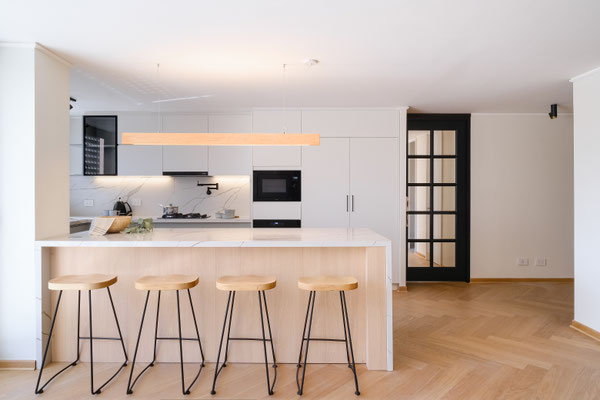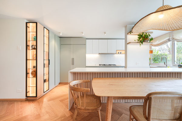 En esta remodelación minimalista, cálida y funcional, pensamos en cada detalle desde la paleta de colores hasta las texturas de sus revestimientos, aportando calidez con la madera y siempre con iluminación puntual y general para generar distintos ambientes.