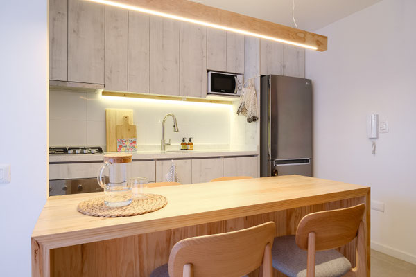 Este proyecto consistió en la transformación completa de un departamento familiar, con el objetivo de generar espacios más amplios, funcionales y acogedores. El corazón de la propuesta fue la cocina, generando un espacio de reunión.
